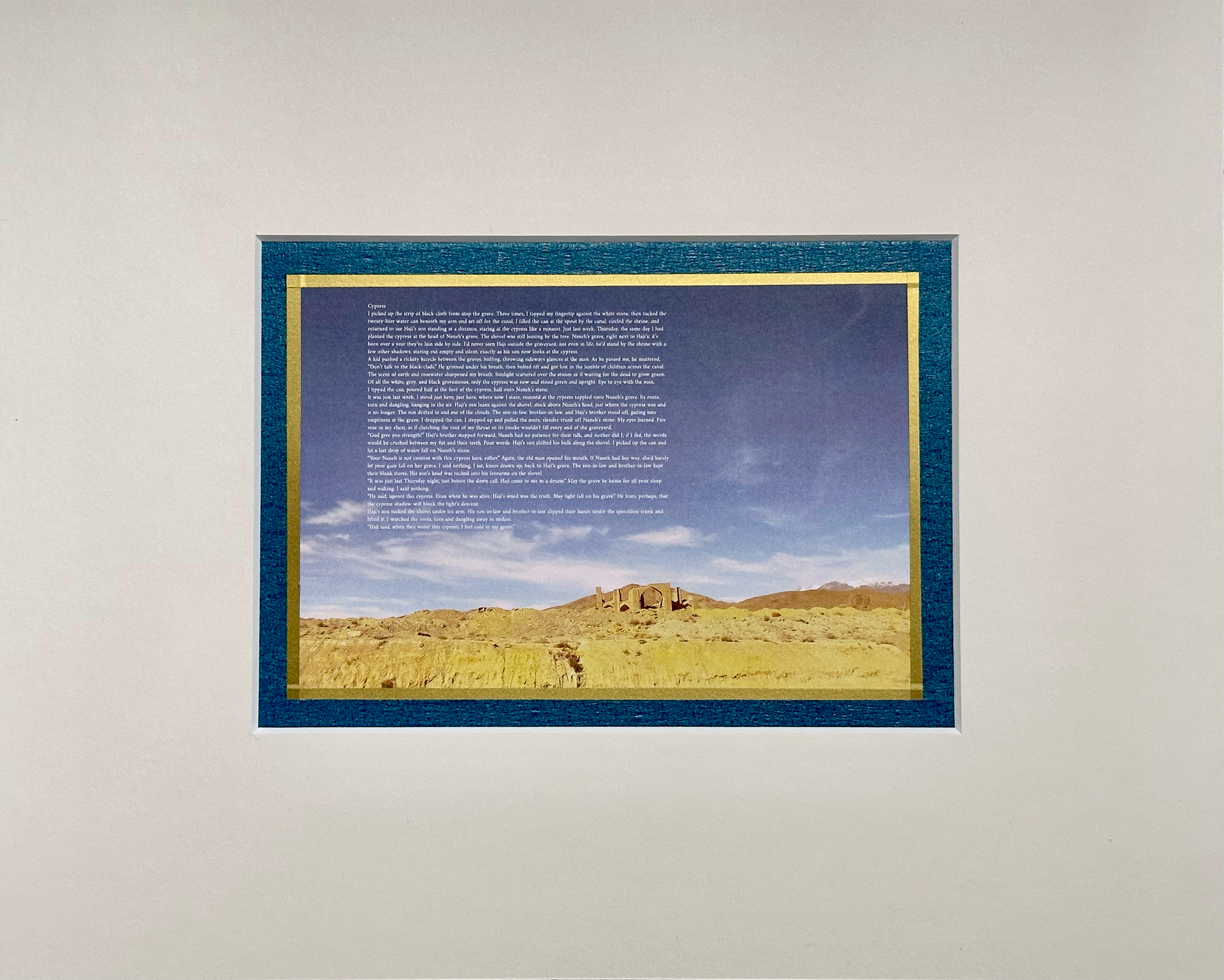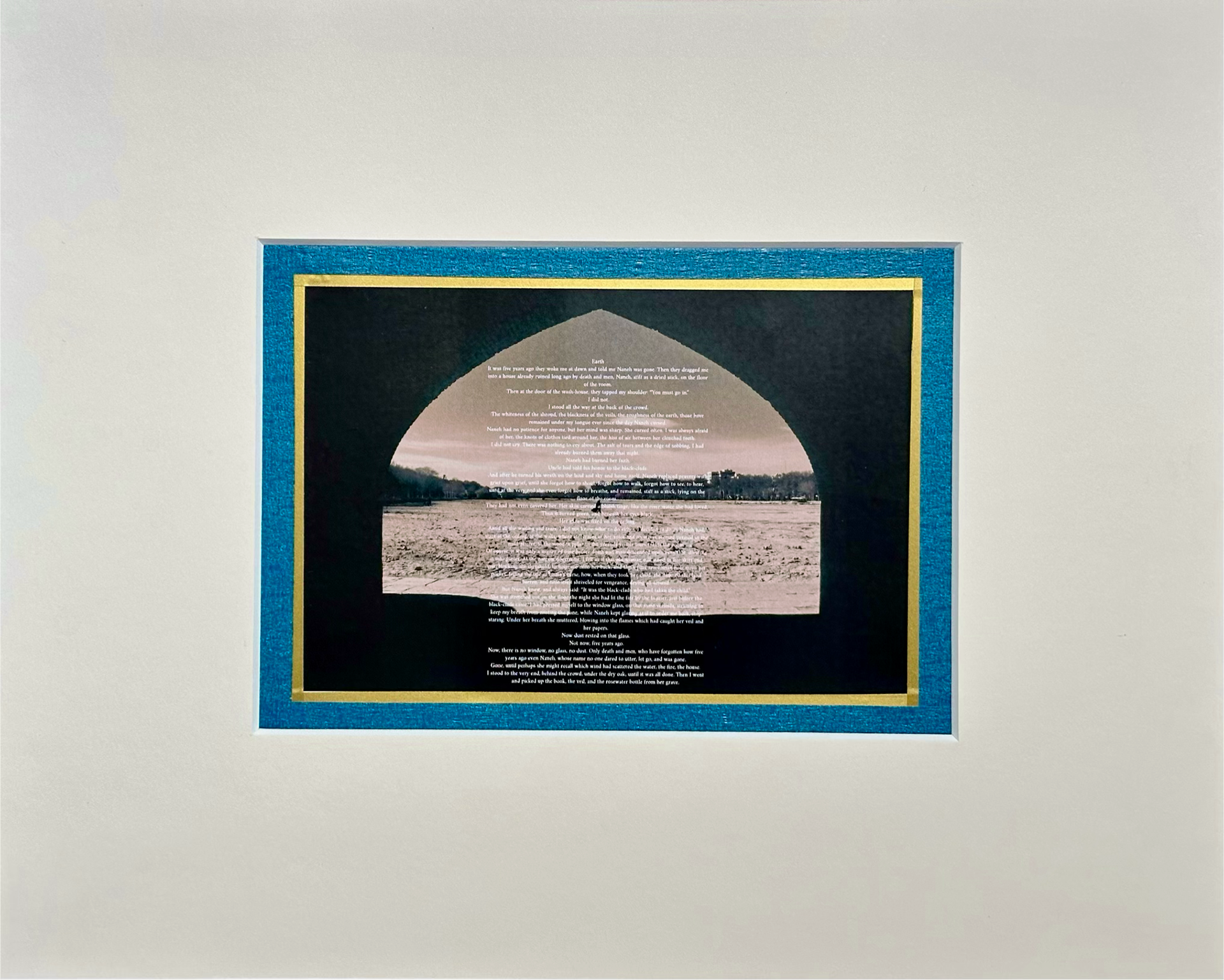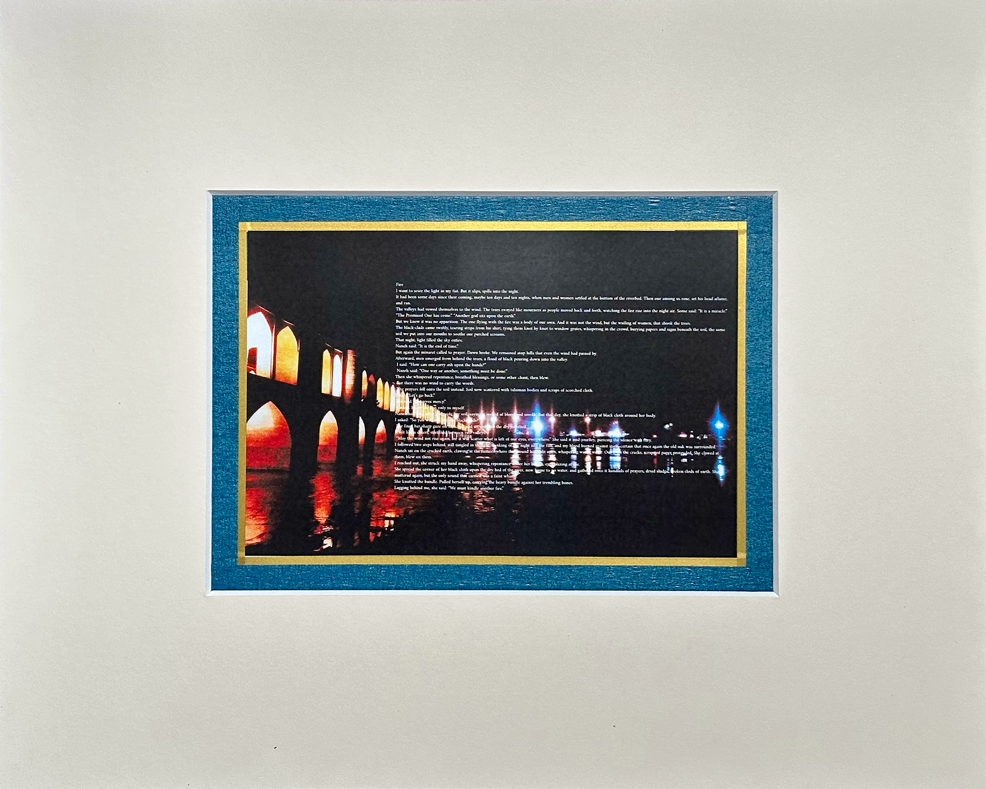 The installation Bayat-e Esfahan consists of six photos with six fictional fragments on each one, captured and written in the past ten years in and about the city of Esfahan, its multilayer history, conservative and traditional culture, and its contemporary tragedy, the complete drought of Zayandeh Rud, the largest river of the Iranian plateau.