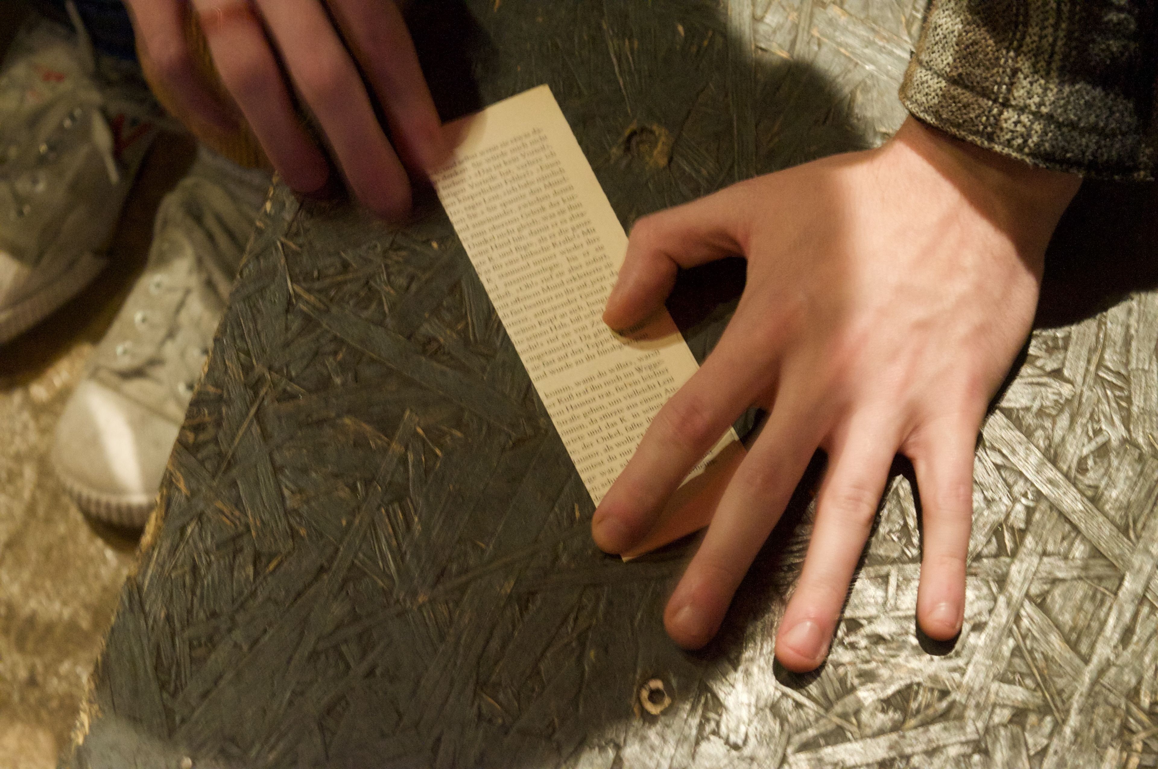 I got the inspiration for this piece from my love-hate relationship with performance, especially performance readings, but now I feel like I simply wanted to mimic Josef K, the main character of The Trial by Franz Kafka.